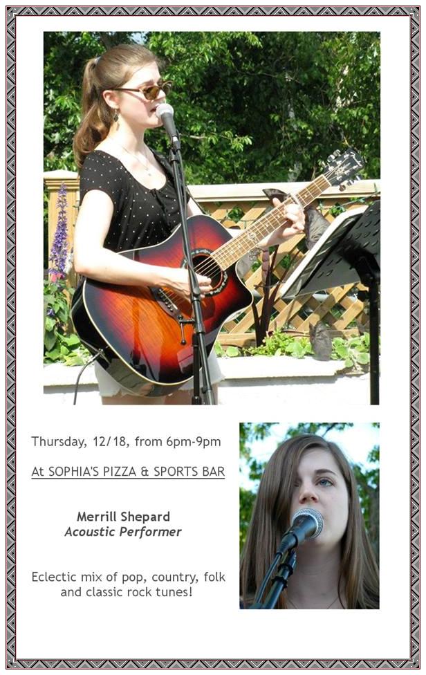 Come on down to Sophia’s Pizza and Sports Bar on Thursday, December 18th! Merrill will be playing from 6-9 PM as part of the Sophia’s Christmas Party. There will be a free buffet until 9 PM. Join the fun for a drink, some food and some great acoustic tunes!