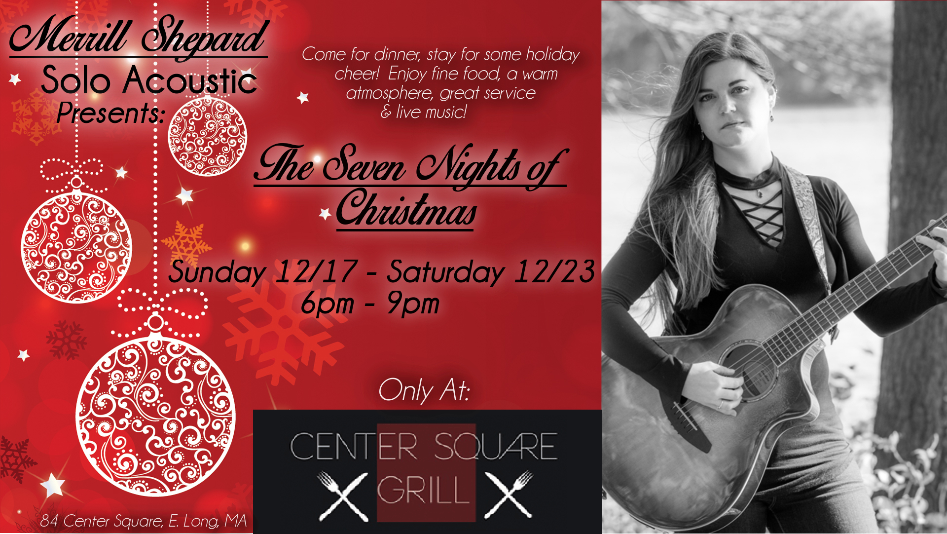 Join us any night this week at Center Square Grill for an excellent meal, superb service and some holiday cheer! We’ve got all your acoustic, Christmas favorites on deck from 6pm – 9pm from now until Saturday night!