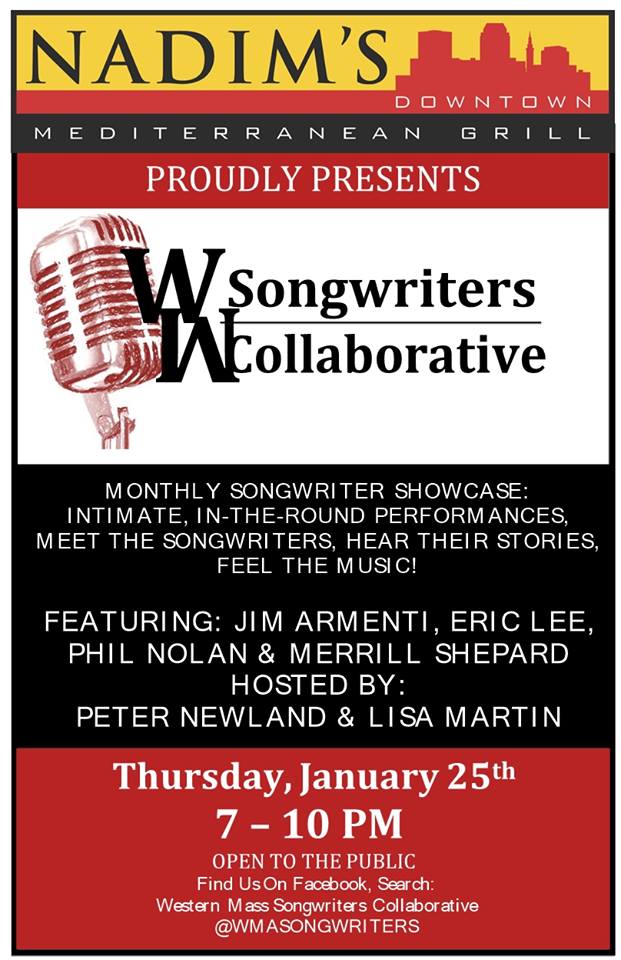 Join us downtown at Nadim’s Mediterranean Restaurant where the Western Mass Songwriter’s Collaborative will feature artists: Jim Armenti, Eric Lee, Phil Nolan, Peter J. Newland, Lisa Martin and Merrill Shepard.